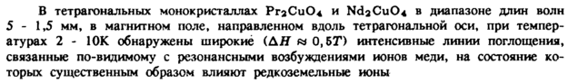 В тетрагональных монокристаллах Рг^СиО* и NdaCuCU в диапазоне длин волн 5-1,5 мм, в магнитном поле, направленном вдоль тетрагональной оси, при температурах 2 10К обнаружены широкие (АЯ и 0,5Т) интенсивные линии поглощения, связанные по-видимому с резонансными возбуждениями ионов меди, на состояние которых существенным образом влияют редкоземельные ионы