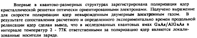 Впервые в квантово-размерных структурах зарегистрирована поляризация ядер кристаллической решетки оптически ориентированными электронами. Получено выражение для скорости поляризации ядер невырожденным двумерным электронным газом. В результате сопоставления расчетного и определенного экспериментально времен продольной релаксации ядер сделан вывод, что в исследованных квантовых ямах GaAe/AlGaAs в интервале температур 2 77К ответственными за поляризацию ядер являются локализованные носители заряда.