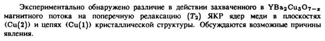 Экспериментально обнаружено различие в действии захваченного в УВ^Си^О-т-х магнитного потока на поперечную релаксацию (Тг) ЯКР ядер меди в плоскостях (Сц(2)) и цепях (Cu(l)) кристаллической структуры. Обсуждаются возможные причины явления.