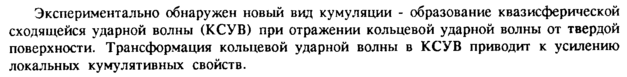 Экспериментально обнаружен новый вид кумуляции образование квазисферической сходящейся ударной волны (КСУВ) при отражении кольцевой ударной волны от твердой поверхности. Трансформация кольцевой ударной волны в КСУВ приводит к усилению локальных кумулятивных свойств.
