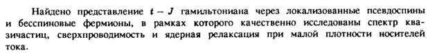 Найдено представление t J гамильтониана через локализованные псевдоспины и бесспиновые фермионы, в рамках которого качественно исследованы спектр квазичастиц, сверхпроводимость и ядерная релаксация при малой плотности носителей тока.