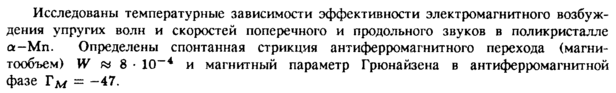 Исследованы температурные зависимости эффективности электромагнитного возбуждения упругих волн и скоростей поперечного и продольного звуков в поликристалле α—Μη. Определены спонтанная стрикция антиферромагнитного перехода (магни-тообъем) W ^ 8 · 10~4 и магнитный параметр Грюнайзена в антиферромагнитной фазе Тм = -47.