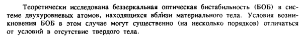 Теоретически исследована беззеркальная оптическая бистаб иль ноет ь (БОБ) в системе двухуровневых атомов, находящихся вблизи материального тела. Условия возникновения БОБ в этом случае могут существенно (на несколько порядков) отличаться от условий в отсутствие твердого тела.