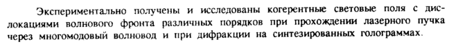 Экспериментально получены и исследованы когерентные световые поля с дислокациями волнового фронта различных порядков при прохождении лазерного пучка через многомодовый волновод и при дифракции на синтезированньгх голограммах.