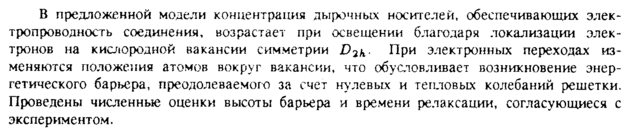 В предложенной модели концентрация дырочных носителей, обеспечивающих электропроводность соединения, возрастает при освещении благодаря локализации электронов на кислородной вакансии симметрии D2kПри электронных переходах изменяются положения атомов вокруг вакансии, что обусловливает возникновение энергетического барьера, преодолеваемого за счет нулевых и тепловых колебаний решетки. Проведены численные оценки высоты барьера и времени релаксации, согласующиеся с экспериментом.