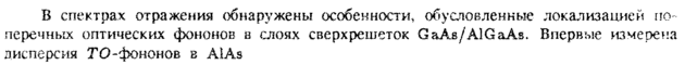 В спектрах отражения обнаружены особенности, обусловленные локализацией поперечных оптических фононов в слоях сверхрешеток GaAs/AlGaAs. Впервые измерена дисперсия ТО-фононов в AlAs