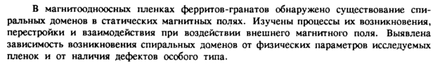 В магнитоодноосных пленках ферритов-гранатов обнаружено существование спиральных доменов в статических магнитных полях. Изучены процессы их возникновения, перестройки и взаимодействия при воздействии внешнего магнитного поля. Выявлена зависимость возникновения спиральных доменов от физических параметров исследуемых пленок и от наличия дефектов особого типа.