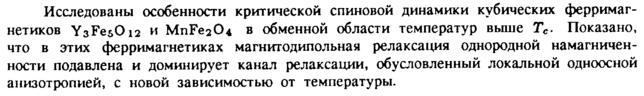 Исследованы особенности критической спиновой динамики кубических ферримаг-нетиков Y3FesOi2 и MnFe204 в обменной области температур выше Тс. Показано, что в этих ферримагнетиках магнитодипольная релаксация однородной намагниченности подавлена и доминирует канал релаксации, обусловленный локальной одноосной анизотропией, с новой зависимостью от температуры.