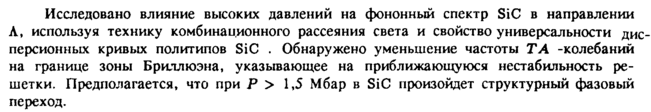 Исследовано влияние высоких давлений на фононный спектр SiC в направлении А, используя технику комбинационного рассеяния света и свойство универсальности дисперсионных кривых политипов SiC . Обнаружено уменьшение частоты ТА -колебаний на границе зоны Бриллюэна, указывающее на приближающуюся нестабильность решетки. Предполагается, что при Ρ > 1,5 Мбар в SiC произойдет структурный фазовый переход.