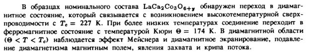 В образцах номинального состава LaCa2Co306+y обнаружен переход в диамагнитное состояние, который связывается с возникновением высокотемпературной сверхпроводимости с Тс — 227 К. При более низких температурах соединение переходит в ферромагнитное состояние с температурой Кюри θ = 174 К. В диамагнитной области (θ < Τ < Тс) наблюдается эффект Мейснера и диамагнитное экранирование, подавление диамагнетизма магнитным полем, явления захвата и крипа потока.