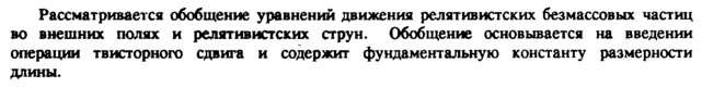 Рассматривается обобщение уравнений движения релятивистских безмассовых частиц во внешних полях и релятивистских струн. Обобщение основывается на введении операции твисторного сдвига и содержит фундаментальную константу размерности длины.