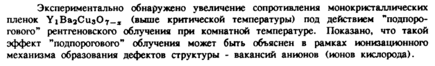 Экспериментально обнаружено увеличение сопротивления монокристаллических пленок Y1Ba3Cu307_, (выше критической температуры) под действием "подпоро-гового" рентгеновского облучения при комнатной температуре. Показано» что такой эффект "подпорогового" облучения может быть объяснен в рамках ионизационного механизма образования дефектов структуры вакансий анионов (ионов кислорода).
