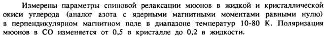 Измерены параметры спиновой релаксации мюонов в жидкой и кристаллической окиси углерода (аналог азота с ядерными магнитными моментами равными нулю) в перпендикулярном магнитном поле в диапазоне температур 10-80 К. Поляризация мюонов в СО изменяется от 0,5 в кристалле до 0,2 в жидкости.