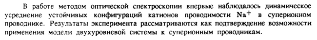 В работе методом оптической спектроскопии впервые наблюдалось динамическое усреднение устойчивых конфигураций катионов проводимости Na+ в супериоином проводнике. Результаты эксперимента рассматриваются как подтверждение возможности применения модели двухуровневой системы к суперионным проводникам.