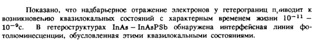Показано, что надбарьерное отражение электронов у гетерограниц приводит к возникновению квазилокальных состояний с характерным временем жизни 10~п — 10-ос. В гетероструктурах InAs InAsPSb обнаружена интерфейсная линия фотолюминесценции, обусловленная этими квазилокальными состояниями.