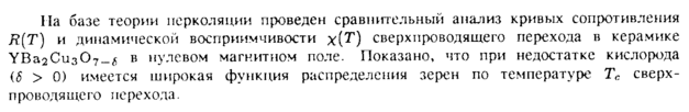 I la базе теории иерколяции проведен сравнительный анализ кривых сопротивления R(T) и динамической восприимчивости χ(Τ) сверхпроводящего перехода в керамике YBa2Cu307_$ в нулевом магнитном поле. Показано, что при недостатке кислорода (δ > 0) имеется широкая функция распределения зерен по температуре Тс сверхпроводящего перехода.