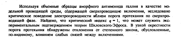Используя объемные образцы аморфного антимонида галлия в качестве модельной проводящей среды, содержащей сверхпроводящие включения, исследовано критическое поведение электропроводности вблизи порога протекания по сверхпроводящей фазе. Найдено, что критический индекс 9—1, что может служить экспериментальным подтверждением теории Шкловского-Эфроса. В узкой окрестности порога протекания обнаружены отклонения от степенного закона, обусловленные, по-видимому, влиянием слабых связей между включениями.