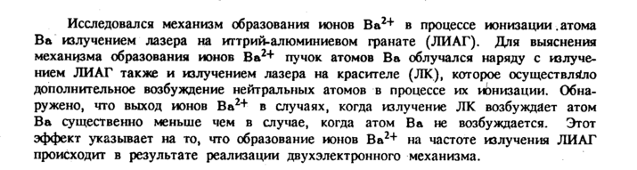 Исследовался механизм образования ионов Ва2+ в процессе ионизации .атома Ва излучением лазера на иттрий-алюминиевом фанате (ЛИАГ). Для выяснения механизма образования ионов Ва2+ пучок атомов Ва облучался наряду с излучением ЛИАГ также и излучением лазера на красителе (ЛК), которое осуществляло дополнительное возбуждение нейтральных атомов в процессе их ионизации. Обнаружено, что выход ионов Ва2+ в случаях, когда излучение ЛК возбуждает атом Ва существенно меньше чем в случае, когда атом Ва не возбуждается. Этот эффект указывает на то, что образование ионов Ва2+ на частоте излучения ЛИАГ происходит в результате реализации двухэлектронного механизма.