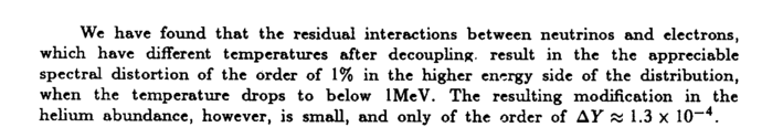 We have found that the residual interactions between neutrinos and electrons, which have different temperatures after decoupling, result in the the appreciable spectral distortion of the order of 1% in the higher energy side of the distribution, when the temperature drops to below lMeV. The resulting modification in the helium abundance, however, is small, and only of the order of AY и 1.3 χ Ю-4.