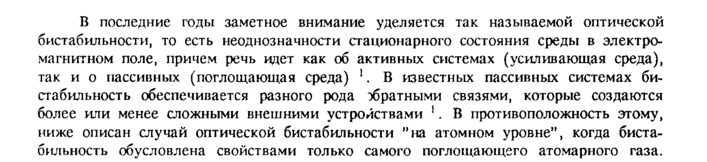 В последние годы заметное внимание уделяется так называемой оптической бистабильности, то есть неоднозначности стационарного состояния среды в электромагнитном поле, причем речь идет как об активных системах (усиливающая среда), так и о пассивных (поглощающая среда) 1. В известных пассивных системах би-стабильность обеспечивается разного рода обратными связями, которые создаются более или менее сложными внешними устройствами 1. В противоположность этому, ниже описан случай оптической бистабильности "на атомном уровне", когда биста-бильность обусловлена свойствами только самого поглощающего атомарного газа.