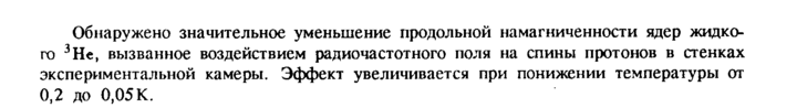 Обнаружено значительное уменьшение продольной намагниченности ядер жидкого 3Не, вызванное воздействием радиочастотного поля на спины протонов в стенках экспериментальной камеры. Эффект увеличивается при понижении температуры от 0,2 до 0.05К.