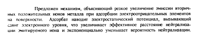 Предложен механизм, объясняющий резкое увеличение эмиссии вторичных положительных ионов металла при адсорбции электроотрицательных элементов на поверхности. Адсорбат наводит электростатический потенциал, вызывающий сдвиг электронного уровня, что увеличивает эффективное расстояние нейтрализации эмитируемого иона и экспоненциально уменьшает вероятность нейтрализации.