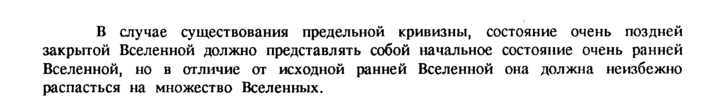 В случае существования предельной кривизны, состояние очень поздней закрытой Вселенной должно представлять собой начальное состояние очень ранней Вселенной, но в отличие от исходной ранней Вселенной она должна неизбежно распасться на множество Вселенных.
