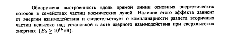 Обнаружена выстроенность вдоль прямой линии основных энергетических потоков в семействах частиц космических лучей. Наличие этого эффекта зависит от энергии взаимодействия и свидетельствует о компланарности разлета вторичных частиц невысоко над установкой в акте ядерного взаимодействия при сверхвысоких энергиях {Ео > Ю,6эВ).