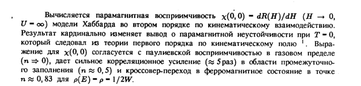 Вычисляется парамагнитная восприимчивость χ(0,0) dR(H)/dH (Я —» О, Uоо) модели Хаббарда во втором порядке по кинематическому взаимодействию. Результат кардинально изменяет вывод о парамагнитной неустойчивости при Τ ш О, который следовал из теории первого порядка по кинематическому полю 1. Выражение для χ(0,0) согласуется с паулиевской восприимчивостью в газовом пределе (п 0), дает сильное корреляционное усиление («5 раз) в области промежуточного заполнения (п лз 0,5) и кроссовер-переход в ферромагнитное состояние в точке η % 0, 83 для p(E)-p-l/2W.