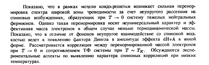 Показано, что в рамках модели кондо-решетки возникает сильная перенормировка спектра широкой зоны проводимости за счет неупругого рассеяния на спиновых возбуждениях, образующих при X -» О систему тяжелых нейтральных фермионов. Однако такая перенормировка носит неуниверсальный характер и эффективная масса электронов в общем случае меньше термодинамической массы. Показано, что в отличие от фононов неупругое взаимодействие со спиновой жидкостью ведет к появлению фактора Дингла в амплитуде эффекта dHvA в явной форме. Рассматривается корреляция между перенормированной массой электронов при Τ —> О и сопротивлением ТФ системы при Τ ~ Τχ. Обсуждаются экспериментальные аспекты по выявлению характера спиновых корреляций при низких температурах.