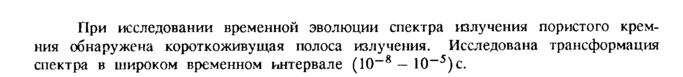 При исследовании временной эволюции спектра излучения пористого кремния обнаружена короткоживущая полоса излучения. Исследована трансформация спектра в широком временном интервале (10~8 — Ю-5) с.