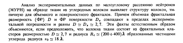 Анализ экспериментальных данных по малоугловому рассеянию нейтронов (МУРН) на образце ткани из углеродных волокон выявляет структуру волокон, типичную для объемного и поверхностного фракталов. Причем объемная фрактальная размерность (ФР) D и ФР поверхности Ds совпадают в пределах экспериментальной погрешности и равны D ~ Da ~ 2,7. Эти факты естественным образом объясняются, если предположить, что волокна ткани состоят из фрактальных кластеров размерностью D ~ 2,7 и радиуса Rc ~ (200 -г 400)λ образованных частицами углерода радиуса го ~ 18 λ.