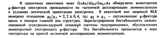 В одиночных квантовых ямах GaAs/Alo,3Gao,7As обнаружена анизотропия ^-фактора электронов проводимости по магнитной деполяризации люминесценции в условиях оптической ориентации электронов. В квантовой яме шириной 80А измерено отношение д\\/д± ™ 2,2 ± 0,4, где дц и д± составляющие у-фактора вдоль и поперек главной оси сгруктуры. Зарегистрирована бистабильность сильносвязанной электронно-ядерной спиновой системы полупроводника, обусловленная анизотропией электронного у-фактора. Эта бистабильность проявляется в виде гистерезиса на кривой магнитной деполяризации люминесценции.