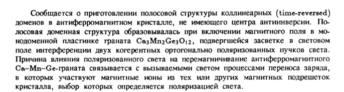 Сообщается о приготовлении полосовой структуры коллинеарных (time-reversed) доменов в антиферромагнитном кристалле, не имеющего центра антиинверсии. Полосовая доменная структура образовывалась при включении магнитного поля в монодоменной пластинке граната СазМп2СезО]2, подвергшейся засветке в световом поле интерференции двух когерентных ортогонально поляризованных пучков света. Причина влияния поляризованного света на перемагничивание антиферромагнитного Ca-Mn-Ge-граната связывается с вызываемыми светом процессами переноса заряда, в которых участвуют магнитные ионы из тех или других магнитных подрешеток кристалла, выбор которых определяется поляризацией света.