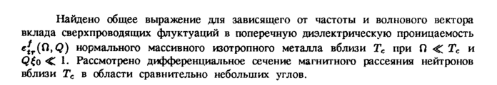 Найдено общее выражение для зависящего от частоты и волнового вектора вклада сверхпроводящих флуктуации в поперечную диэлектрическую проницаемость e£.(0,Q) нормального массивного изотропного металла вблизи Те при Ω < Тс и Qio <С 1Рассмотрено дифференциальное сечение магнитного рассеяния нейтронов вблизи Тс в области сравнительно небольших углов.