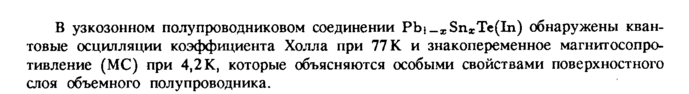 В узкозонном полупроводниковом соединении Pbi_rSnrTc(In) обнаружены квантовые осцилляции коэффициента Холла при 77 К и знакопеременное магнитосопро-тивление (МС) при 4,2К, которые объясняются особыми свойствами поверхностного слоя объемного полупроводника.