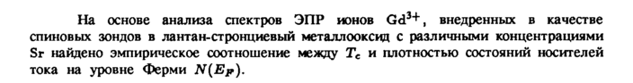 На основе анализа спектров ЭПР ионов Gd3+, внедренных в качестве спиновых зондов в лантан-стронциевый металлооксид с различными концентрациями Sr найдено эмпирическое соотношение между Тс и плотностью состояний носителей тока на уровне Ферми N(EF),