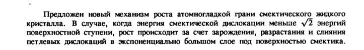 Предложен новый механизм роста атомногладкой грани смектического жидкого кристалла. В случае, когда энергия смектической дислокации меньше \/2 энергий поверхностной ступени, рост происходит за счет зарождения, разрастания и слияния петлевых дислокаций в экспоненциально большом слое под поверхностью смектика.