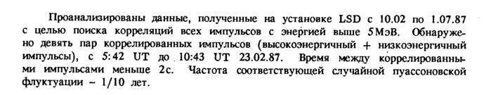 Проанализированы данные, полученные на установке LSD с 10.02 по 1.07.87 с целью поиска корреляций всех импульсов с энергией выше 5МэВ. Обнаружено девять пар коррелированных импульсов (высокоэнергичный + низкоэнергичный импульсы), с 5:42 UT до . 10:43 UT 23.02.87. Время между коррелированными импульсами меньше 2 с. Частота соответствующей случайной пуассоновской флуктуации 1/10 лет.
