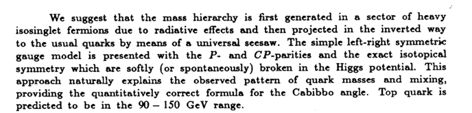 We suggest that the mass hierarchy is first generated in a sector of heavy isosinglet fermions due to radiative effects and then projected in the inverted way to the usual quarks by means of a universal seesaw. The simple left-right symmetric gauge model is presented with the Pand CP-parities and the exact isotopical symmetry which are softly (or spontaneously) broken in the Higgs potential. This approach naturally explains the observed pattern of quark masses and mixing, providing the quantitatively correct formula for the Cabibbo angle. Top quark is predicted to be in the 90— 150 GeV range.