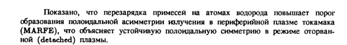 Показано, что перезарядка примесей на атомах водорода повышает порог образования полоидальной асимметрии излучения в периферийной плазме токамака (MARFE), что объясняет устойчивую полоидальную симметрию в режиме оторванной (detached) плазмы.
