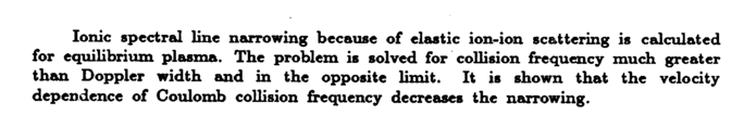 Ionic spectral line narrowing because of elastic ion-ion scattering is calculated for equilibrium plasma. The problem is solved for collision frequency much greater than Doppler width and in the opposite limit. It is shown that the velocity dependence of Coulomb collision frequency decreases the narrowing.