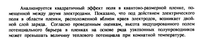Анализируется квадратичный эффект поля в квантово-размерной пленке, помещенной между двумя электродами. Показано, что под действием электрического поля в области пленки, расположенной вблизи краев электродов, возникает двойной слой заряда. Согласно проведенным оценкам, высота индуцированного полем потенциального барьера в пленках на основе ряда узкозонных полупроводников может превышать величину теплового потенциала при комнатной температуре.