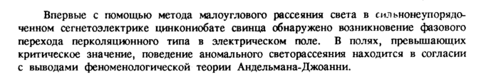 Впервые с помощью метода малоуглового рассеяния света в сильнонеупорядоченном сегнетоэлектрике цинкониобате свинца обнаружено возникновение фазового перехода перколяционного типа в электрическом поле. В полях, превышающих критическое значение, поведение аномального светорассеяния находится в согласии с выводами феноменологической теории Андельмана-Джоанни,