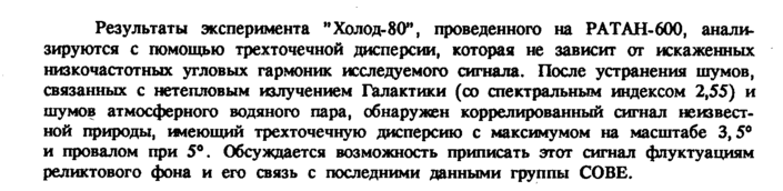 Результаты эксперимента "Холод-80", проведенного на РАТАН-600, анализируются с помощью трехточечной дисперсии, которая не зависит от искаженных низкочастотных угловых гармоник исследуемого сигнала. После устранения шумов, связанных с нетепловым излучением Галактики (со спектральным индексом 2,55) и шумов атмосферного водяного пара, обнаружен коррелированный сигнал неизвестной природы, имеющий трехточечную дисперсию с максимумом на масштабе 3,5° и провалом при 5е. Обсуждается возможность приписать этот сигнал флуктуациям реликтового фона и его связь с последними данными группы СОВЕ.
