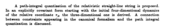 A path-integral quantization of the relativistic straight-line string is proposed. In an explicitly covariant form starting with the initial four-dhnentional dynamics of the relative coordinate τμ the three-dimentional one is derived. A connection between constraints appearing in the canonical formalism and the path integral quantization is discussed.