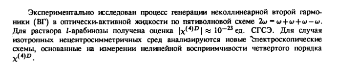 Экспериментально исследован процесс генерации неколлинеарной второй гармоники (ВГ) в оптически-активной жидкости по пятиволновой схеме 2ш ω+ω+ω — ω. Для раствора /-арабинозы получена оценка |x'4'D| « 10_23ед. СГСЭ. Для случая изотропных нецентросимметричных сред анализируются новью "спектроскопические схемы, основанные на измерении нелинейной восприимчивости четвертого порядка x<4>D-