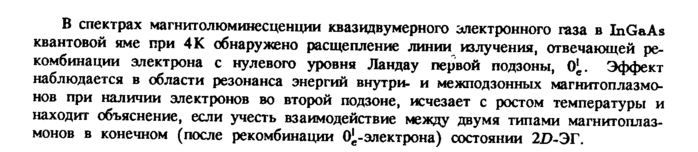 В спектрах магнитолюминесценции квазидвумерного алектронного газа в InGaAs квантовой яме при 4 К обнаружено расщепление линии излучения, отвечающей рекомбинации электрона с нулевого уровня Ландау первой подзоны, Oj.. Эффект наблюдается в области резонанса энергий внутрии межподзонных магнитоплазмо-нов при наличии электронов во второй подзоне, исчезает с ростом температуры и находит объяснение, если учесть взаимодействие между двумя типами магнитоплаз-монов в конечном (после рекомбинации (^-электрона) состоянии 2£>-ЭГ.