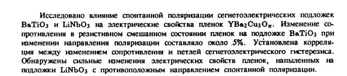 Исследовано влияние спонтанной поляризации сегнетоэлектрических подложек ВаТЮз и LiNb03 на электрические свойства пленок УВагСизО». Изменение сопротивления в резистивном смешанном состоянии пленок на подложке ВаТЮз при изменении направления поляризации составляло около .5%. Установлена корреляция между изменением сопротивления и петлей сегнетоэлектрического гистерезиса. Обнаружены сильные изменения электрических свойств пленок, напыленных на подложки LiNb03 с противоположным направлением спонтанной поляризации.