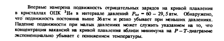 Впервые измерена подвижность отрицательных зарядов на кривой плавления в кристаллах ОЦК 3Не в интервале давлений Рм 60 29,5атм. Обнаружено, что' подвижность постоянна выше 36 атм и резко убывает при меньших давлениях. Падение подвижности при малых давлениях может служить указанием на то, что концентрация вакансий на кривой плавления вблизи минимума на Ρ Г-диаграмме экспоненциально убывает с понижением температуры.